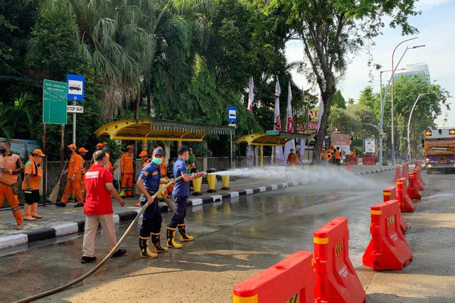 Mereka membawa truk-truk besar, mobil penyapu jalan otomatis, serta alat semprot air tekanan tinggi.